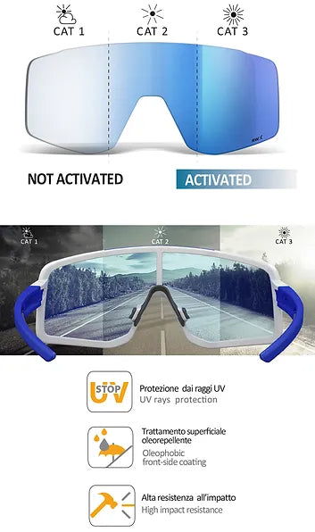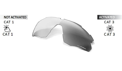 Chromolex Fotocromático: Las lentes fotocromáticas contienen sustancias sensibles a los rayos UV que modifican su estructura química según la intensidad de la luz. El lente tiene un color base claro que se oscurece cuando la luz del sol es más intensa, para volver rápidamente al color inicial cuando la luz disminuye. Esta tecnología permite llevar siempre las gafas desde las zonas de sombra a las zonas especialmente brillantes y viceversa. Los colores disponibles son CRX naranja y humo (categoría paso de 1 a 3) y bronce (disponible en la categoría 1-3 en los modelos con lente simple: CSPEED, 012, 011, 006; en la categoría 2-4 en todas las demás gafas).